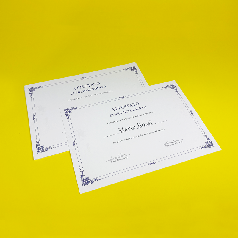 I diplomi e gli attestati sono il modo classico per celebrare traguardi, riconoscere i risultati e conferire premi formali. Che si tratti di successi accademici, formazione aziendale, certificati per dipendenti o eventi speciali, sono un ricordo tangibile dell'impegno e della dedizione di una persona.